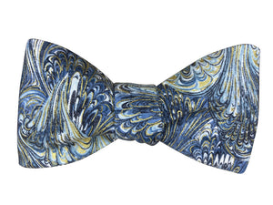 A striking bow tie showcasing dramatic marbled patterns in shades of grey and metallic gold. Bold sweeping plumes create an almost Art Nouveau effect, with swirling feather-like formations that radiate outward. This eye-catching design combines traditional marbling with contemporary colour, resulting in a truly distinctive statement piece.